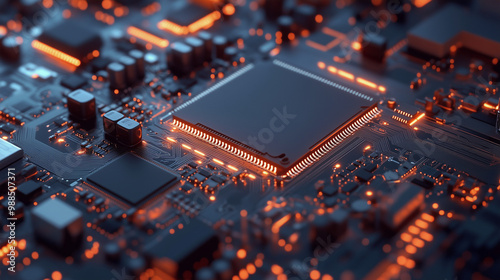 Przestrzenna wizualizacja układu elektronicznego, pokazująca szczegółowe połączenia i elementy na płycie głównej.