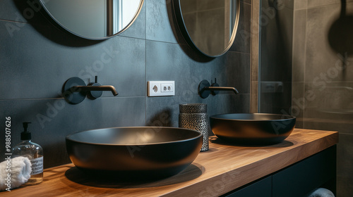 Wygodna łazienka hotelowa z wiszącą drewnianą szafką i elegancką czarną umywalką.