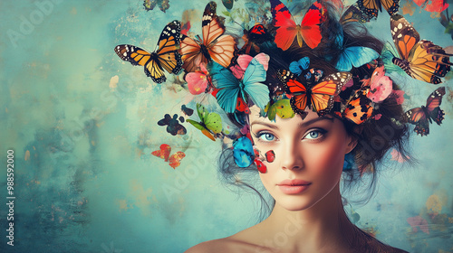 Surrealistyczny portret kobiety z motylami jako ozdobami we włosach. Kolaż w stylu pop-art podkreśla piękno i nietypowość, zachęcając do refleksji nad wolnością i naturą.