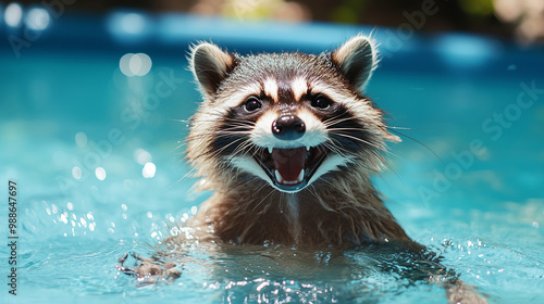 Szop pracz skacze radośnie w wodzie, rozchlapiąc krople dookoła.