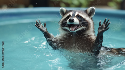 Szop pracz skacze radośnie w wodzie, rozchlapiąc krople dookoła.