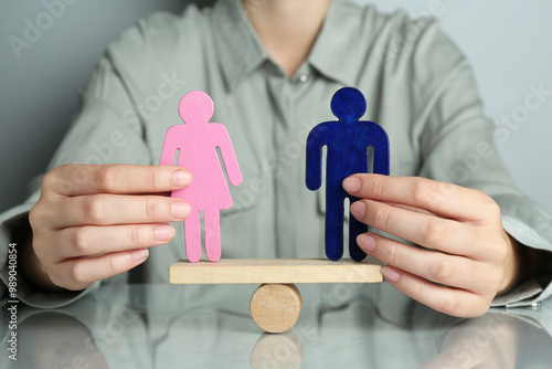 Gender equality concept. Woman with male and female figures on scales at grey table, closeup