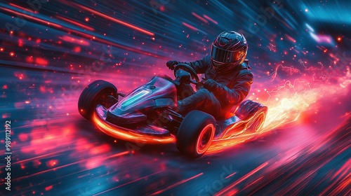 Dynamic neon go kart racing display featuring a futuristic racer navigating at high speeds vibrant gladers laser outlines in thrilling visual effects