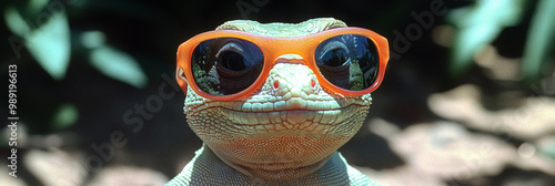 A lizard wearing orange sunglasses looks directly at the camera.