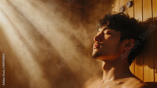 穏やかなマインドフルネスのリトリートのために温かいサウナでリラックスする穏やかな日本人男性
