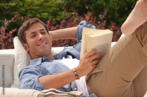 Hombre relajado recostado leyendo un libro en la piscina de su casa.