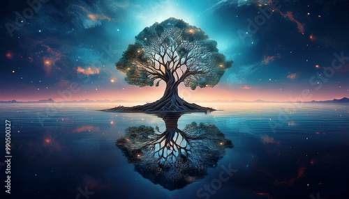 tree of life reflected in ocean under night sky, Chiaroscuro, epic wide angle, dystopian, matte Neo-romantic, metaphysical, concept art