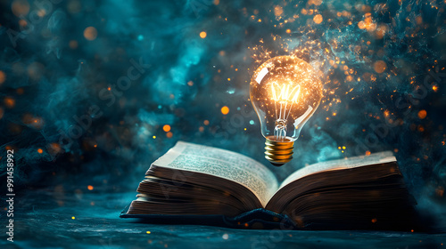 un libro con informacion y una bombilla encendida aprendizaje e investigacion adquiriendo inteligencia y cratividad