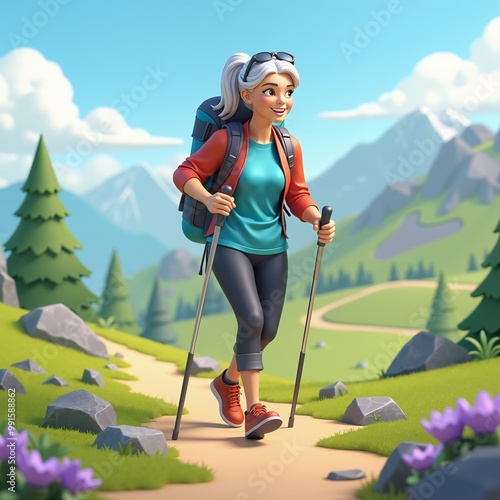 3D illustration of an elderly woman hiking in the mountains with trekking poles. Active lifestyle, outdoor adventure, and nature in cartoon style.