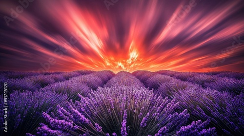 A field of lavenders bathed in the golden light of a sunset, with the sun positioned perfectly at the center, casting a warm glow on everything while soft clouds decorate the back