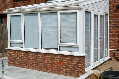 White lean to conservatory with blinds on all windows and doors, seen from the outside on a sunny day.