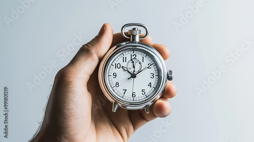 A hand holds a silver pocket watch with a white face and black hands.