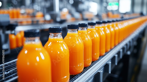 Nowoczesna fabryka z przemysłowym przenośnikiem, na którym przemieszcza się rząd butelek wypełnianych naturalnym sokiem.