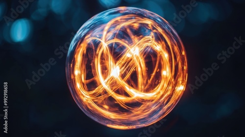 A glowing orb with swirling light patterns against a blurred background.