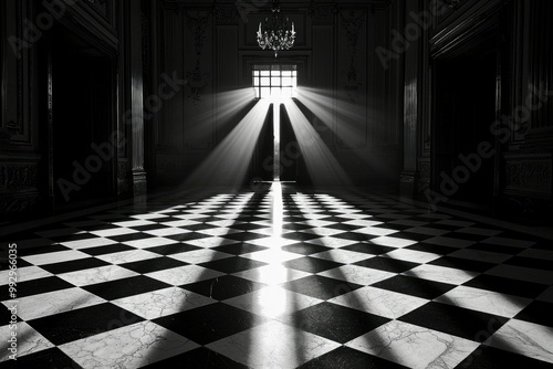 Sunbeams Illuminating a Checkerboard Floor in a Grand Hallway