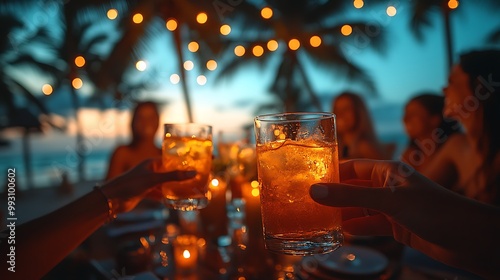 A group of friends clinking glasses under fairy lights at night, luxury resort cabana setting, cocktails glowing under soft ambient lighting, palm trees silhouetted in the background,