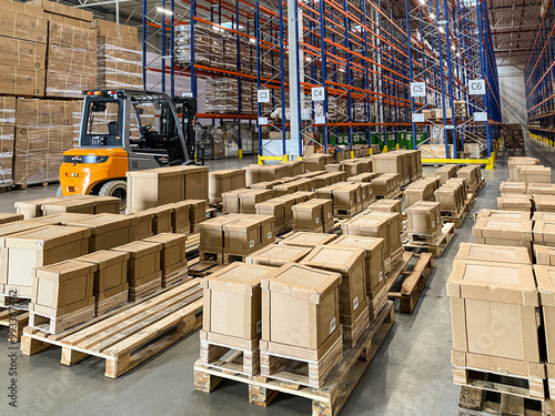 Wnętrze magazynu logistycznego, hala magazynowa, regały, paczki, wózek widłowy. Dystrybucja towarów, ładunek na paletach.