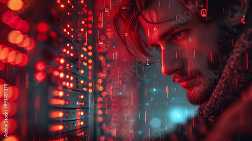 a red hat hacker in dark room sitting in front of his computer glowing computer screens committing digital cybercrime code and data stream across the monitors digital warfare environment Generative AI