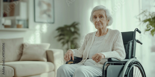 An elderly woman of European appearance sits in a wheelchair. Disabled care concept. Advertising banner.