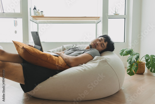 Asian man sleep over the laptop lying on the bean bag sofa in living room.