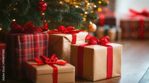 Brightly wrapped gift boxes in various sizes with shiny ribbons, placed under a holiday tree.