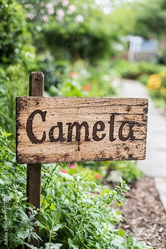 A community garden sign made from recycled materials. The sign showcases the garden’s name and values of sustainability