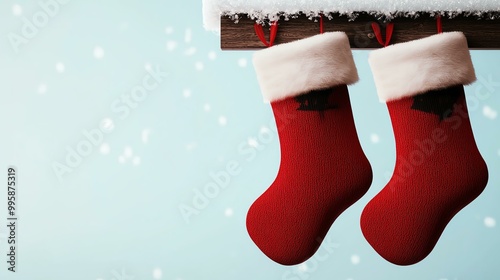 Two red Christmas stockings hanging on a snowy ledge against a light blue background with falling snowflakes.
