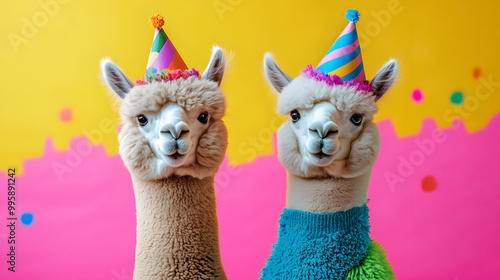 Two alpacas in crazy party outfits with party hats on colorful background, advertising, creative party animal concept, copy space, birthday party invitation card