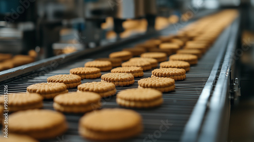 Na taśmie produkcyjnej ciasteczka delikatnie toczą się po linii, równomiernie ułożone i starannie wypieczone.