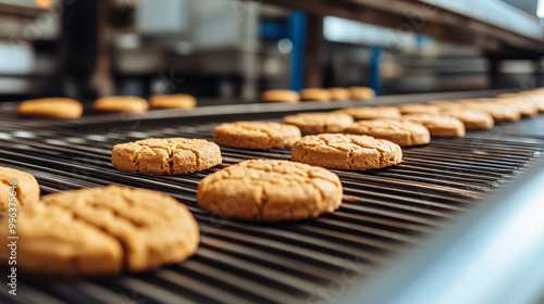 Na taśmie produkcyjnej ciasteczka delikatnie toczą się po linii, równomiernie ułożone i starannie wypieczone.