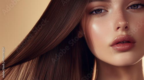 Młoda kobieta z długimi, lśniącymi brązowymi włosami jest przykładem harmonii między urodą a pielęgnacją.