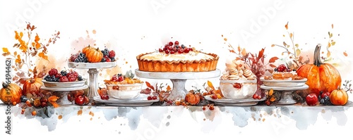 Pumpkin pie centerpiece, Thanksgiving table filled with desserts, autumn ambiance, Watercolor style