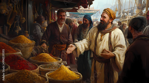 Oil painting, sailor, bargaining, spices, silk road port, interactions, historical art, rich textures, exotic aromas, ancient commerce, trade winds. Silk Road Traders. Illustration