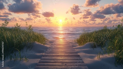 A long boardwalk leading to the white sand beach and ocean at sunset with a few shrubs on either side