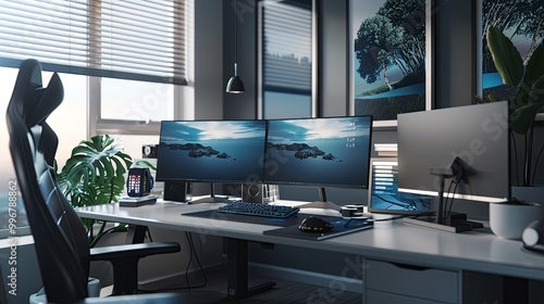 A modern office desk setup with a sleek laptop, dual monitors, and various tech accessories