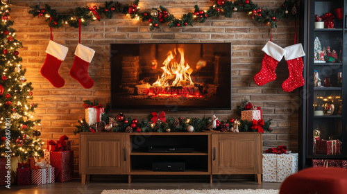Cozy Christmas living room with fireplace, decorated tree, stockings, and gifts around, holiday season concept