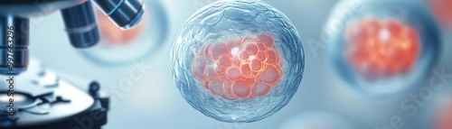 Close-up of the first few cells of an embryo under a microscope, microscopic detail, early embryonic science