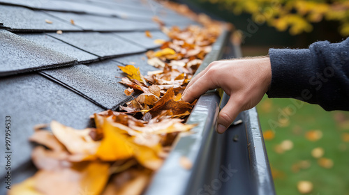 Męska dłoń, umiejętnie sięgająca w głąb rynny, zdejmuje z niej liście i zanieczyszczenia, które zagrażają skuteczności odprowadzania wody.
