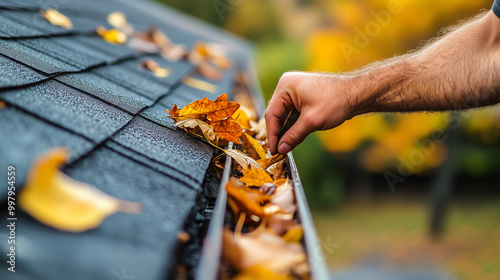Męska dłoń, umiejętnie sięgająca w głąb rynny, zdejmuje z niej liście i zanieczyszczenia, które zagrażają skuteczności odprowadzania wody.