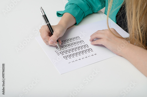 Studentka rozwiązuje test wielokrotnego wyboru, karta odpowiedzi ankieta