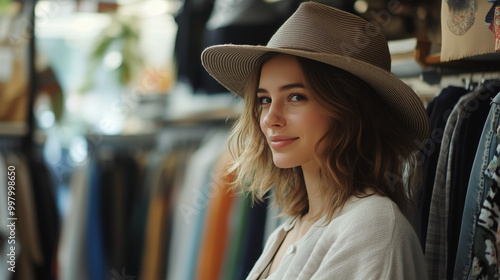 W eleganckim sklepie odzieżowym piękna młoda kobieta w stylowym kapeluszu z zainteresowaniem przegląda kolekcję ubrań.