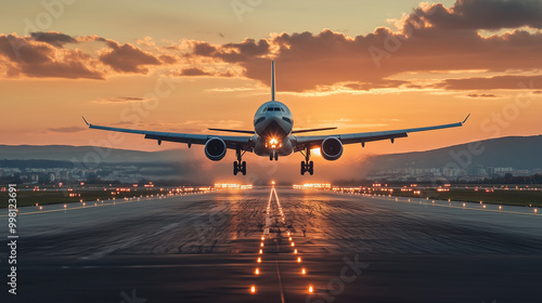 Samolot pasażerski o imponujących rozmiarach startuje z lotniska, z opuszczonym podwoziem, gdy pierwsze promienie wschodzącego słońca rozświetlają horyzont.