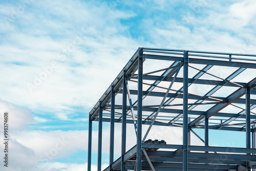 Steel Framework Rises Against Vibrant Sky During Construction at Bustling Urban Site