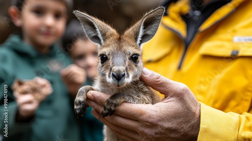 Zoo staff holding a baby kangaroo, kids watching in awe, educational interaction, stock photo style