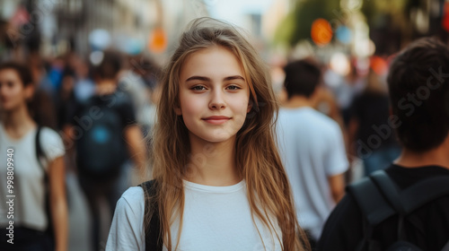 Wśród tłumu na ulicy, pełnego różnorodnych twarzy i emocji, na pierwszy plan wysuwa się kobieta, która z uśmiechem spogląda w obiektyw.