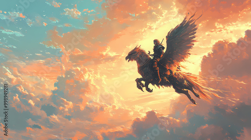 Knight riding a griffin in the sky, generative ai. Griffin Rider. Illustration