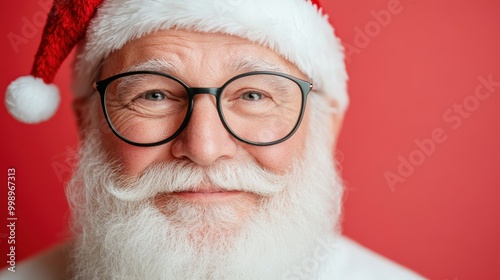 A person wearing a Santa hat and festive attire poses joyfully against a bright red background, capturing the holiday spirit and season's joy.