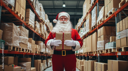 Święty Mikołaj, otoczony mnóstwem kartonowych paczek, z zapałem planuje swoje świąteczne trasy dostawcze.