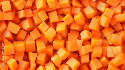 a close-up, top-down view of diced carrots spread across the entire frame, filling the image with their vibrant orange color and uniform cubic shapes