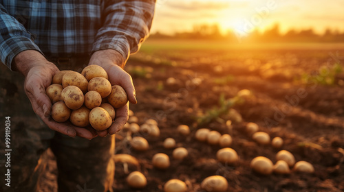 Ręce rolnika pełne ziemniaków na tle pola o zachodzie słońca.